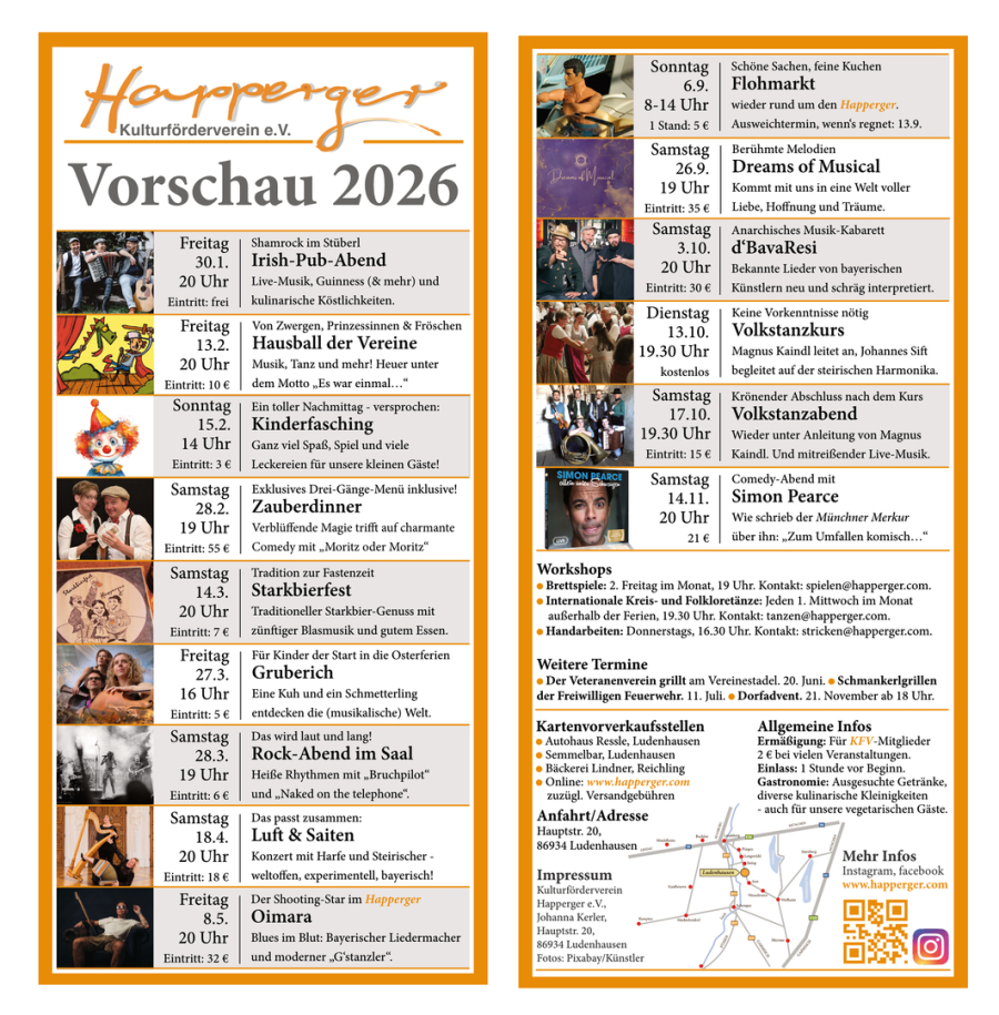 Hier findet Ihr die komplette Programmvorschau des Kultur- und Veranstaltungsjahres 2026 im Happerger - prall voll mit tollen Events für jeden Geschmack und jedes Alter!